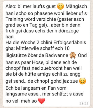 "S‘krässiste isch dass ich merke wie nöd nume de chopf seit wos lang gaht sondern au min körper es mitspracherecht het. Das hani jahrelang nüme ka. Fühl mich sogar mittlerwiile (meistens) wohl i mim körper obwohl ich no lang nöd a dem punkt bin woni gern hi wet. Vo mir us gseh het sich ez scho jeglichi investition is coaching mit dir meh we uszahlt. Danke nomal defür "⠀